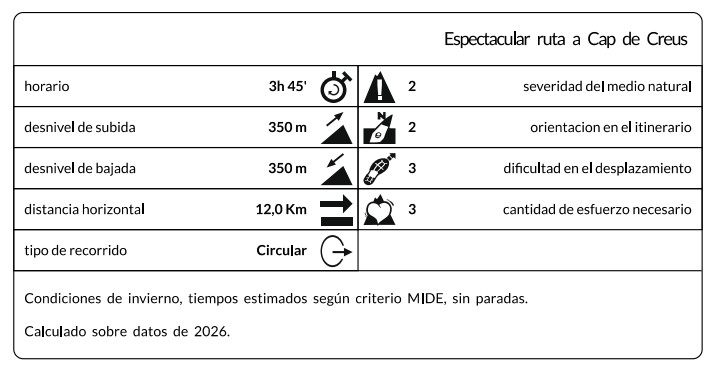 L’excursió Camí de ronda i el far del cap de Creus és una ruta circular de 12,0 km amb 350 m de desnivell positiu i 350 m desnivell negatiu. L’activitat té una durada de 4h30′ – 5h30′, l’hora de finalització aproximada és a les 14.30. La durada de l’activitat inclou parades per a desdejunar, fer fotos, les explicacions i la caminada 💪.