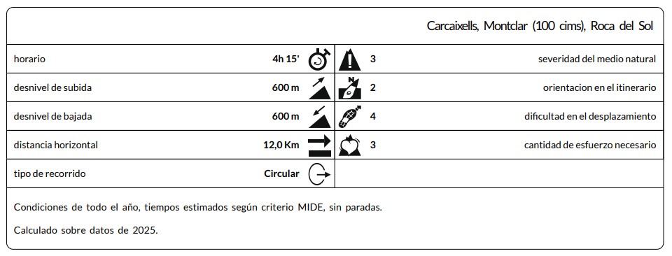 L’excursió Carcaixells, Montclar i la Roca del sol és una ruta circular de 12,0 km amb 600 m de desnivell positiu i 600 m desnivell negatiu. L’activitat té una durada de 5 – 6 hores, l’hora de finalització aproximada és a les 15:00. La durada de l’activitat inclou parades per a esmorzar, dinar, fer fotos, les explicacions i la caminada  💪.